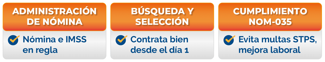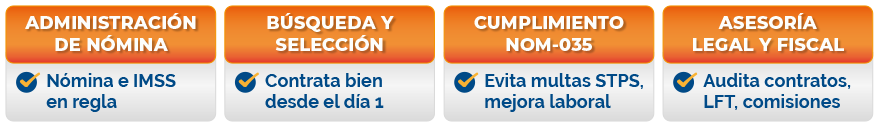 Administración de Nómina • Búsqueda y Selección de Talento • Cumplimiento NOM-035 • Asesoría Legal y Fiscal